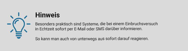 Mittlerweile gibt es zahlreiche unterschiedliche Sicherheitssysteme für Haus und Wohnung. Die am meisten eingesetzte, klassische Variante reagiert direkt vor Ort visuell und akustisch auf einen Einbruchversuch. Oft handelt es sich hierbei um ein Alarmsystem mit Bewegungsmelder.