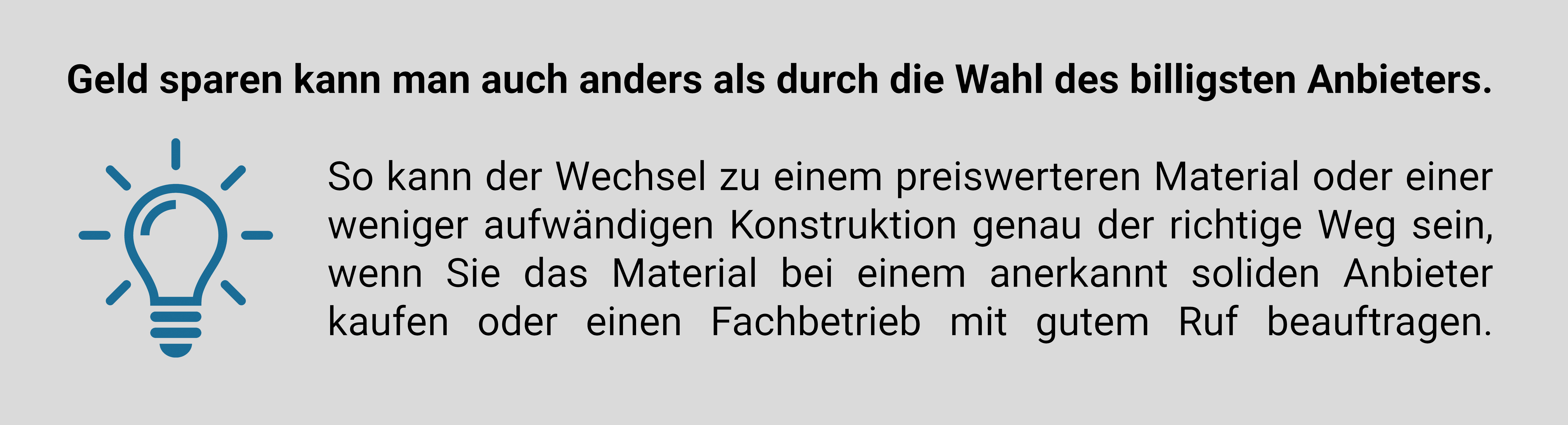 Wenn es um den Gesamtpreis für das Material geht, haben Baumärkte und Anbieter im Internet gegenüber klassischen Fachbetrieben meist die Nase vorn. Aber – Sie wissen es mittlerweile schon – dieser Preisvorteil gilt vielfach nur im Augenblick des Kaufs. Natürlich gibt es auch über diese Vertriebswege qualitativ gute und preiswerte Angebote, aber es kann sich als schwierig erweisen, hier weiße von schwarzen Schafen zu unterscheiden.