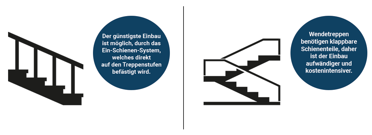 Die erforderliche Treppenliftart und die Beschaffenheit der vorhandenen Treppe bestimmen wesentlich die Einbaukosten für einen Treppenlift. So ist beim Einbau eines Plattformlifts mehr Aufwand als bei einem Treppensitzlift gegeben. Die Installationstechnik bei einer kurvigen Treppe ist ebenso teurer als bei einer geraden Treppe. Bei einer geraden Treppe können im Regelfall Standardschienen im Ein-Schienen-System auf den Treppenstufen befestigt werden. Zum Lifteinbau an einer kurvigen Treppe, dazu zählen Wendeltreppen, müssen die Schienen maßgerecht zur jeweiligen Treppe gefertigt werden. Klappbare Schienenteile sind teurer als Standardschienen.