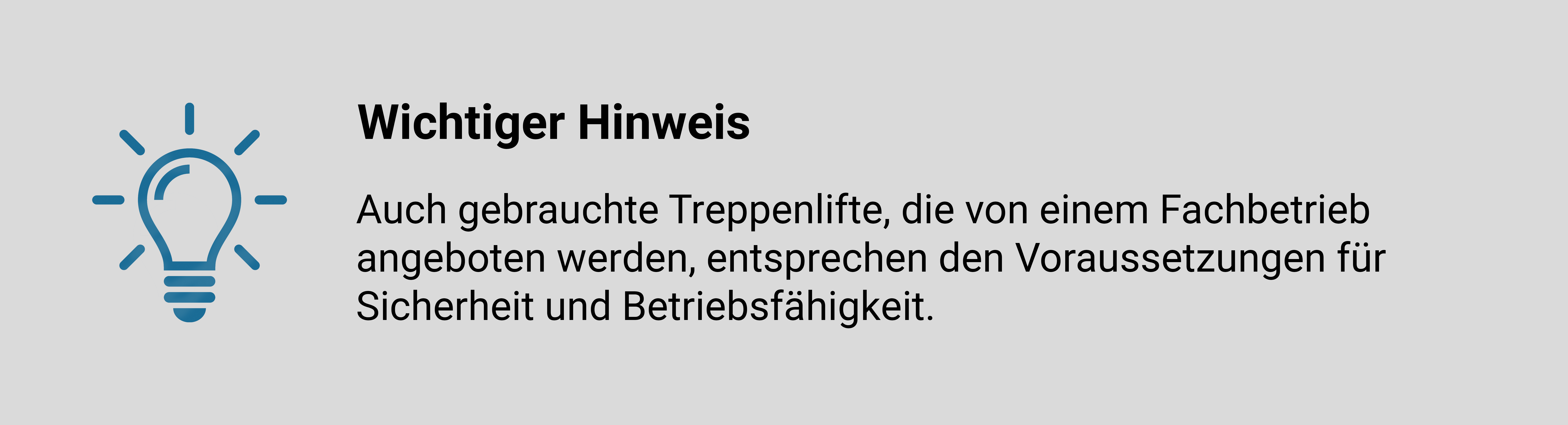 Jeder gebrauchte Lift wird vor dem Verkauf gründlich überprüft und gereinigt. Verschleißteile werden bei gleicher Qualität ausgetauscht. Im Einzelfall kann auch eine Mietvereinbarung sinnvoll sein. Dazu muss absehbar sein, dass der Lift nur für eine bestimmte Zeit erforderlich ist. Eine begrenzte Nutzungsdauer könnte beispielsweise bei Reha-Maßnahmen der Fall sein.
